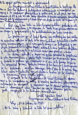 Declaración pública de los presos políticos de la Cárcel Pública de Santiago, realizan un llamado a todos los chilenos y a la solidaridad internacional a manifestar su apoyo por los compañeros presos políticos de la galería Nº 6 del penal, que han iniciado el 25 de este mes una huelga de hambre de carácter indefinido.