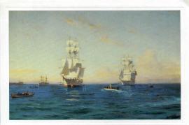 Tarjeta de navidad donde se observa un dibujo de barcos. En su interior se lee un saludo de navidad y año nuevo. Hay una firma ilegible. La tarjeta es de Sol y Mar S.A.