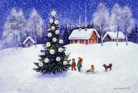 Tarjeta de navidad donde se observa un dibujo de un paisaje nevado. En su interior se lee un saludo de navidad dirigido a Claudio, de Pamela y Arturo.